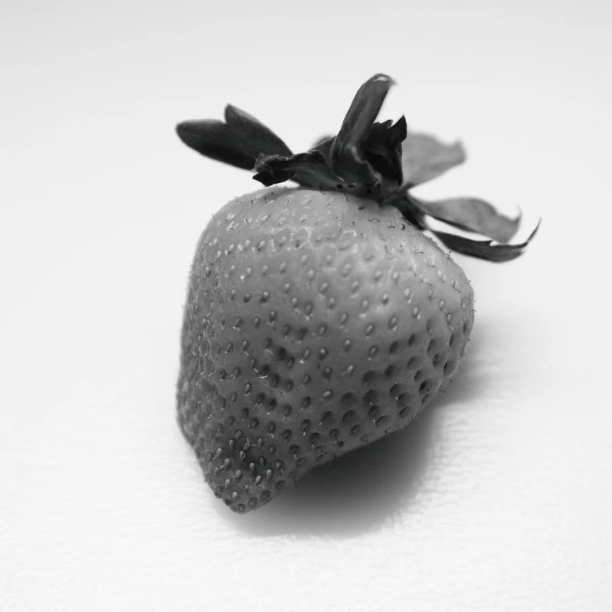 1/004 (2025) is a photographic work presented as a vertical sequence of five matte prints. Using a fixed camera, it documents the gradual decay of a strawberry over time. The images shift from color to black and white, with the top image showing the strawberry at its most decayed and most vivid, while the bottom image shows it at its most intact and least saturated.